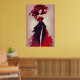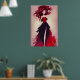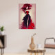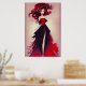This poster features a fashion sketch of a bold fashionable woman with beautiful red hair wearing a stunning long black and red skirt with a luxurious red and black top.
