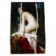 This design features a painting by the French artist William-Adolphe Bouguereau (1825–1905). It depicts a beautiful young woman who is undressed after bathing in a wild pool of water. She is kneeling on a patch of grass at the edge of the pool, and she is smiling gently at the viewer as she runs her fingers teasingly through her hair. Her skin is milky white and soft. She is leaning on an elegant piece of red fabric and she has a white towel, which she is going to dry her body with. The sole of one of her feet is raised in the air as she kneels. The original artwork was painted by Bouguereau in 1864.