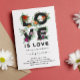Charming floral lesbian wedding invitation with LOVE IS LOVE written in large letters above the simple wedding invitation wording. The letters are decorated with pretty flowers and greenery in the colours of the lesbian flag.