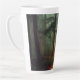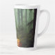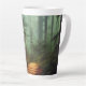 Beautiful and serene AI assisted fantasy digital artwork latte mug features wooden path thru misty forest trees.