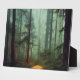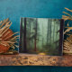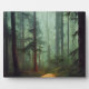 Beautiful and serene AI assisted fantasy digital artwork square tabletop plaque features wooden path thru misty forest trees.