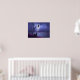 This poster feature a beautiful landscape with a full moon over water. On the bank is a leafless tree with a silhouette owl admiring the moon. Below the tree is a decorative silhouette deer walking towards the water through plants and flowers glowing from the moon light.