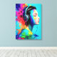Beautiful girl with headphones closed her eyes and enjoying the music. Portrait in profile in splashes of color. Digital Art.