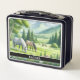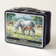 Beautiful grazing horses personalised lunch box with a different image on front and back, edit the name yourself when you order.