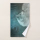 Hand towel with a photograph of a gorgeous furry fluffy grey wolf. In the background is a dark forest with trees. Magical mystical vibe.