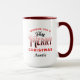 Personalised Christmas coffee mug. Pretty cow and rooster on her head. Background has a red rustic barn with Christmas wreaths on it. A pretty watercolor scene of a snowy winter day on the farm.