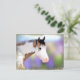Our Beautiful Horse Postcards have a photo of our cute paint horse with lovely purple pastel colours behind him and gold trim. The horse postcard would be great for any horse lover. The card is fully customisable where you can resize the photo or add text.