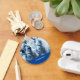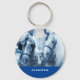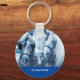 Key chain with a photograph of a pair of horses hitched together. A snowy day and a blue filter creates a magical scene.