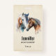 Name badge with a beautiful watercolor drawing. Featuring a pair of horses, brown and white. Head and neck visible with dripping paint along the base of their neck. Southwestern vibe.