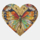 A pretty heart shaped sticker with a front illustration of a beautiful gold, teal and orange butterfly surrounded by yellow, white and purple flowers. It's done with an impasto style and just emanates beauty and grace.