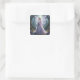 A beautiful fairy wearing a flowing lavender dress and a necklace made of pearls with roses in her long lavender hair and light purple dragonfly-like wings holding a rose stands in a magical forest surrounded by blue and purple flowers and moss-covered trees.