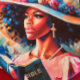 Beautiful African-American lady with her Bible ready for Bible study. The artwork on the tote bag is a mixture of acrylic paint and oil created on a digital tablet. She has a lovely hat with multi-coloured floral roses.