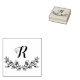 Monogram rubber stamp with your initial in a pretty swirly script above a hand-drawn twigs forming a half wreath of leaves and berries.