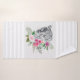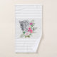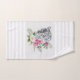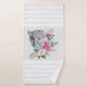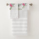 Towel set with a beautiful illustration featuring a grey, black and white leopard portrait. This lovely animal is surrounded by a tropical flower bouquet. Elegant, exotic and lovely. Surrounded by classy grey stripes.