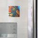 A magnet with an oil painted digital image of a close up of a lions face, with piercing yellow eyes. Dominant colours include orange and yellow. Looking proud, regal and fierce.