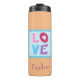 This amazing design features a lovely peach background with a "Love" stamp positioned in the middle. The stamp displays the word "Love" written in blue, pink, and purple block font. Located directly underneath is a template for showcasing your name. Add your photo or any other element to the design. Add this thermal tumbler to your cart today!