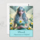 A beautiful blue haired fairy with pale yellow wings wearing a pretty aqua coloured dress and an aquamarine necklace holds a single daffodil while standing in a field of daffodils.
