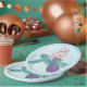 Beautiful Pink Haired Cartoon Mermaid with multi coloured tail sitting on top of a sea turtle paper plate, can easily add birthday child's name for a personal touch.