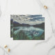 This Save the Date wedding announcement features a beautiful photograph of a lake surrounded by mountains. The sky is filled with enchanting clouds that are reflected in the water. *