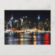 Gorgeous, colourful photo of the New York skyline at night with its lit up buildings being reflected in the dark river.