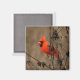 Awesome red bird in the branches of a dead or fall tree with brown leaves. The background makes the bright red of the birds feathers stand out and pop.