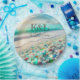 Beautiful blue and teal ocean waves with a blue sky with clouds, a white sandy beach with green and blue sea glass. Add initials and wedding date in the personalise area.