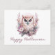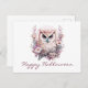 Emblazoned across the top of the postcard are the words "Happy Halloween," elegantly scripted to complement the overall design. The festive greeting adds a touch of whimsy and celebration, making it perfect for spreading Halloween cheer. The combination of the owl, floral elements, and festive text creates a postcard that is both captivating and delightful.
