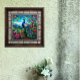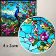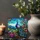 Beautiful Peacock 2 Among Flower Garden features a colourful peacock perched in a tree with it's tail feathers flowing down against a background of rich foliage and hills and flowers blooming done with a stained-glass effect on a ceramic tile. There are many uses for these wonderful ceramic tiles.