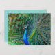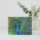 Postcard featuring a magnificent peacock with its beak open and tail feathers opened in a wide fan, showing off his beautiful iridescent green, blue and bronze coloured feathers. Unique card for bird and nature lovers. Photo taken in Arcadia, California.
