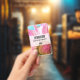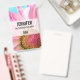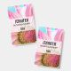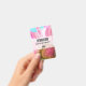 A name tag with a vibrant pink and white flower. Close up photograph of this enchanting flower really grabs your attention.
