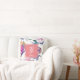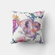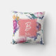Front: A monogram stamp. Framed at the centre goes the first letter of your name in white against light pink, with your first name under it in a much smaller size. All the letters are cursive. The background of the pillow, both front and back: several different colourful flowers. The flowers are drawn by hand from Etsy's Watercolor Stock.