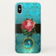 Elegant cool vintage style floral with beautiful red pink rose.Colourful vibrant damask pattern ,Elegant, classy and unique design with a brignt teal aqua blue 3D gem stone by Bulgan Lumini (c).Easy to customise with your initials