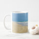 Beautiful beach photography showing the serene beauty of the Port Aransas seashore. A pretty sandpiper stands at the edge of the lovely blue green waters looking out over the calm ocean on a bright sunshine day. Perfect seaside Christmas mug gift for those who love this beautiful Texas beach town.