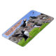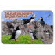 Beautiful 4" x 6" Puffin Scripture Magnet of a colourful, detailed scene where a cute adult Puffin with spread wings, on the left, is showing his attentive offspring how to fly. Another lesson is being taught in the background to a younger Puffin offspring by an adult Puffin. To the right is a juvenile Puffin offspring who is facing the audience in defiance of the parent's instructions while balancing on a boulder. This scene accompanies the Bible verse Proverbs 22:6, "Train up a child in the way he should go and when he is old, he will not depart from it." This magnet makes a wonderful gift or can be used to remind us of the Word of God.