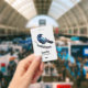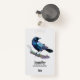 A name tag with a lovely watercolor drawing of a crow. Dark blue and vibrant purple colours accentuate the beauty of this bird.