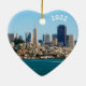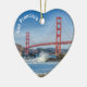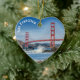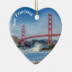 The beautiful Golden Gate Bridge in San Francisco on a heart shaped ornament. Two different photographs with the iconic bridge and the downtown skyline.