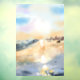 In this vibrant oil painting, a stunning seascape unfolds under a bright, sunny sky. The shimmering ocean reflects the warmth of a summer day, inviting viewers into a scene alive with beach life and vacation vibes. Waves gently lap against the shore, creating a rhythmic pattern that adds to the tranquil atmosphere. In the distance, mountains rise majestically, their peaks reaching towards the clear blue heavens. A lone boat bobs peacefully on the water, while abstract figures dot the sandy beach, enjoying the beauty and serenity of this picturesque landscape. It's a perfect blend of natural beauty and leisure, capturing the essence of a happy, sunny day by the sea.