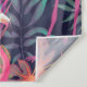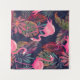 Beautiful seamless tropical pattern with pink flamingo and palm leaves on dark background. Abstract summer texture