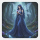 A beautiful fairy wearing a flowing dark blue dress and a necklace made of sapphires with sapphires in her long dark blue hair and translucent dragonfly-like wings holding an aster stands in a shallow pond in a magical forest surrounded by asters, orange mushrooms and trees covered in vines, flowers and mushrooms.