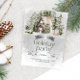 The artwork features a wooden cabin nestled among evergreen trees, symbolising comfort, togetherness, and the beauty of winter retreats. A stack of firewood beside the cabin hints at warmth and hospitality, while the muted snowy background evokes the calm of a winter’s evening. The natural watercolor textures give the design an artisanal feel, making it both welcoming and elegant.