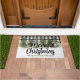 Beautiful snowfall winter season cute doormat. This christmas doormat is black and white buffalo plaid in the background. It looks so cosy with the snowfall and the watercolor pine trees woods. The Text Merry Christmas is customizeable and the Family name as well.