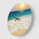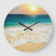 This Inspirational closeup sand beach sea and sky shining sunset creates a calm relaxing summer mood decor. A Panoramic tropical beach sunset seascape horizon ocean photography, filled with beautiful vibrant golden and orange colours of the sunset, blue and turquoise of the seawater, with a flying seagull and water sparkles.