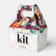 An elegant & fancy wedding favour box recovery kit design with a mix of beautiful summer flowers on a white and magenta background and customisable black typography on a transparent white and gold frame background.