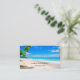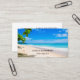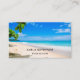 Business cards with a lovely photograph. A white sandy beach with azure blue water. Relaxing image with a sunny sky and gentle foamy surf with some cute tropical leaves framing the image.