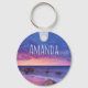 A keychain with a lovely photograph featuring striking colours of purple, blue and pink at sunset.