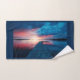 Hand towel with a gorgeous photograph. A scenic spot. A nice calm lake with a wooden dock stretching outwards. Setting sun provides beautiful colours in the sky, vibrant red and blue.