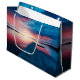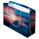 Gift bag with a gorgeous photograph. A scenic spot. A nice calm lake with a wooden dock stretching outwards. Setting sun provides beautiful colours in the sky, vibrant red and blue.