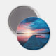 Magnet with a gorgeous photograph. A scenic spot. A nice calm lake with a wooden dock stretching outwards. Setting sun provides beautiful colours in the sky, vibrant red and blue.
