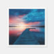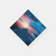 Paper napkins with a gorgeous photograph. A scenic spot. A nice calm lake with a wooden dock stretching outwards. Setting sun provides beautiful colours in the sky, vibrant red and blue.