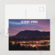 Give someone who loves Colorado Springs beautiful views this beautiful card featuring the city name in white text, purple clouds at sunset over the city and Cheyenne Mountain in the background.